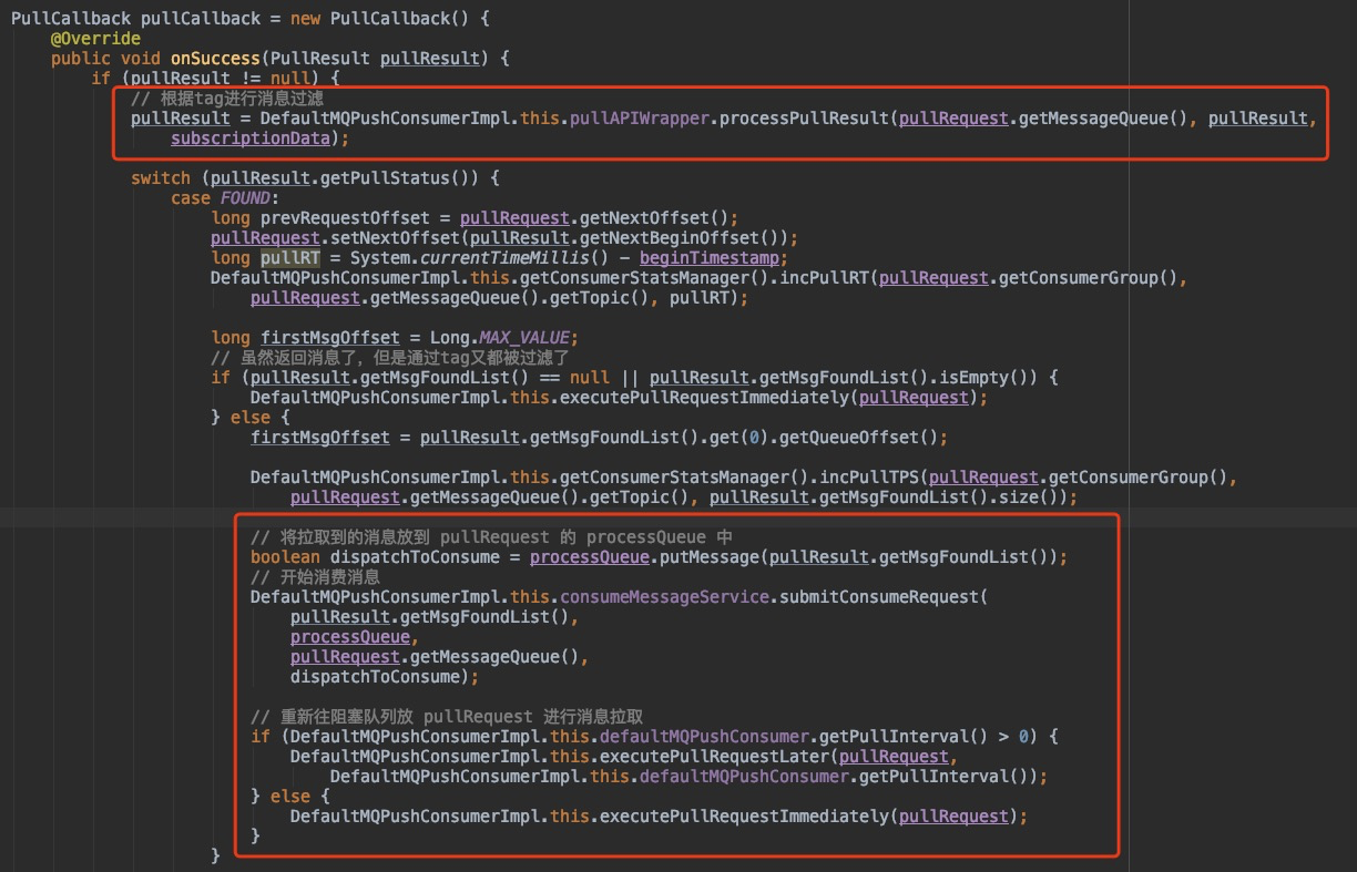 从上一级我们知道,消息会交给PullCallback的实现类来进行消费,PullCallback的实现类有2个,一个是DefaultMQPullConsumerImpl的匿名内部类,一个是DefaultMQPushConsumerImpl的匿名内部类,正好对应两种消息消费模式,我们只分析DefaultMQPushConsumerImpl中PullCallback的处理逻辑