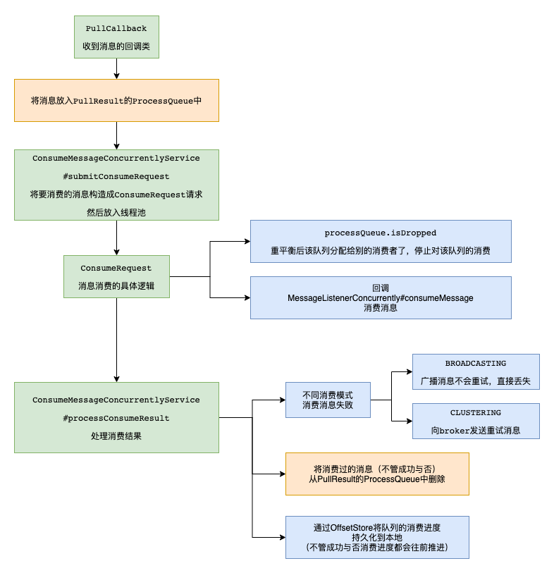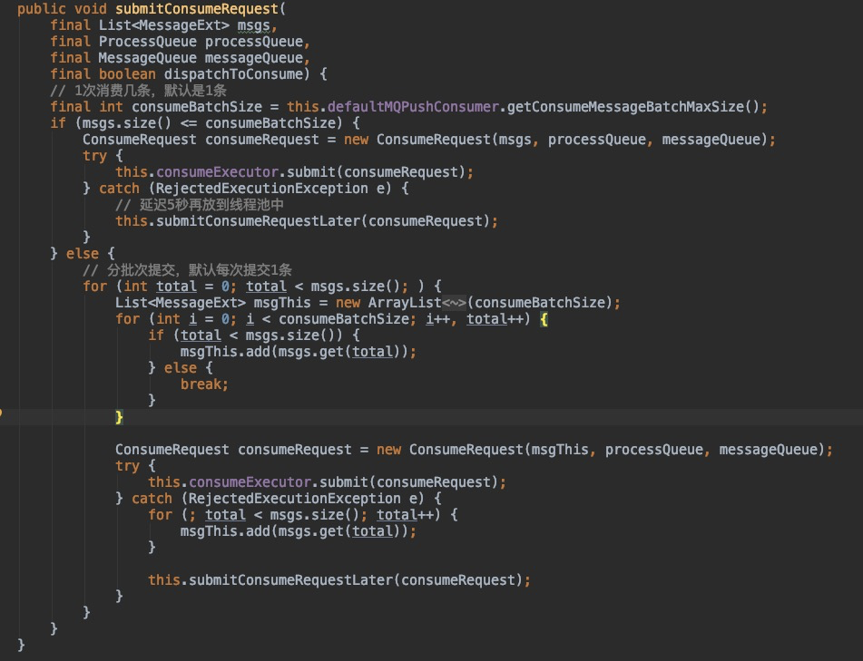 当拉到消息时,会通过tag对消息进行过滤。然后调用ConsumeMessageConcurrentlyService#submitConsumeRequest进行消息消费。最后往阻塞队列放PullRequest持续进行拉取