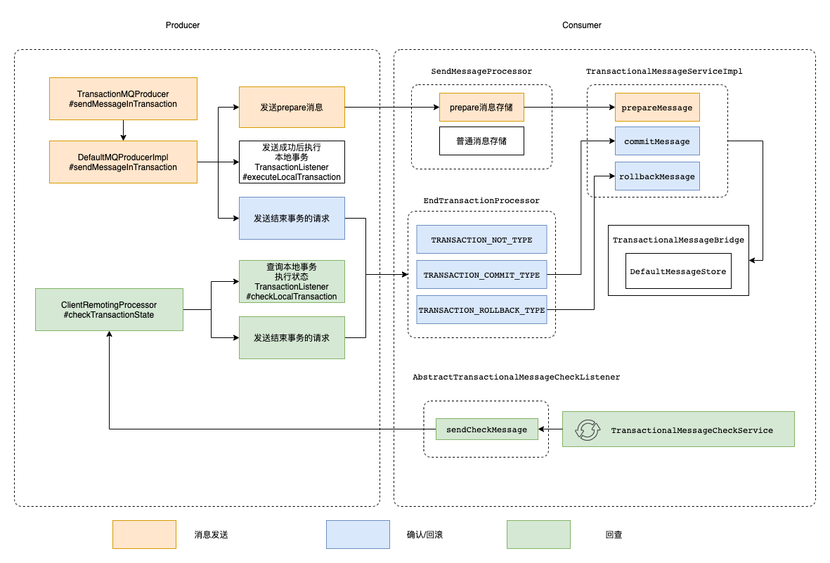 事务状态回查就是通过RMQ_SYS_TRANS_HALF_TOPIC(半消息存储的topic)和RMQ_SYS_TRANS_OP_HALF_TOPIC(已经处理的半消息的topic)来确定那些需要回查的半消息,根据回查结果确实是否要投递消息