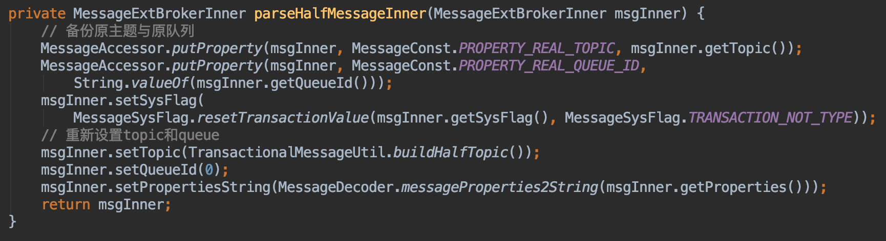 当消息是一个半消息的时候,备份原来的topic和queueId到消息属性中,然后重新设置topic=RMQ_SYS_TRANS_HALF_TOPIC,queueId=0,存储到commitLog中,这样消费者就消费不了这条消息
