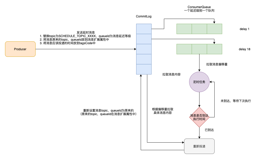 - 如果到达投递时间,则从commitLog中拉取消息的内容,重新设置消息topic,queueId为原来的(原来的topic,queueId在消息扩展属性中),然后将消息投递到commitLog中,此时消息就会被分发到对应的队列中,然后被消费