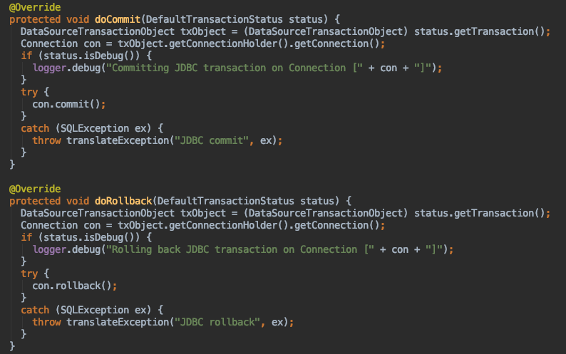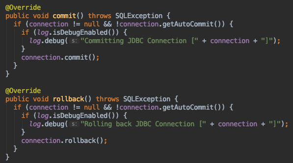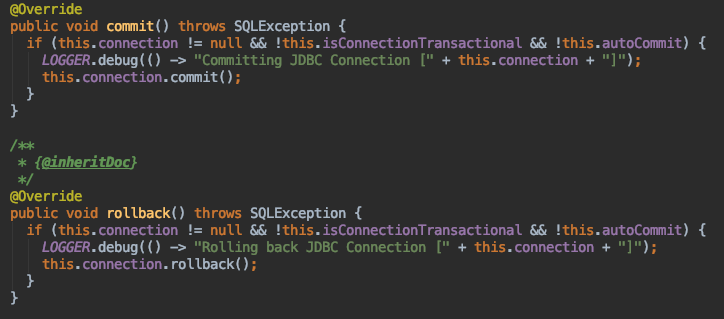 但是真正执行事务的时候,一般情况下不会由SpringManagedTransaction来执行,因为我们一般都把事务交给spring来管理,当把事务交给spring管理的时候this.isConnectionTransactional=true,因此commit和rollback相当于是空实现