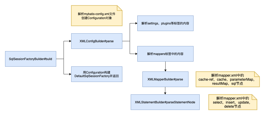 mybatis解析配置阶段的代码还是比较简单的,基本上就是对配置文件中的各种属性进行解析,然后将值保存到Configuration对象中,因此直接画个流程图就略过了。比较重要的过程,比如sql的解析过程我会单开一节来分析