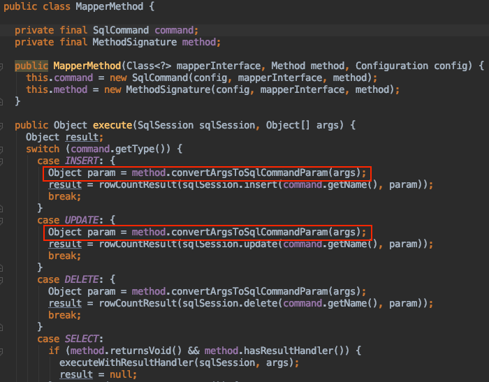 到了mybatis时代,使用Mapper接口的方式来执行sql时,会调用到MapperMethod#execute方法,因为通过Mapper接口调用时,有可能传入多个参数,而SqlSession执行sql时只支持单个参数,所以我们要通过执行method.convertArgsToSqlCommandParam(args)将多个参数合并为一个参数,那么合并的逻辑是怎样的?