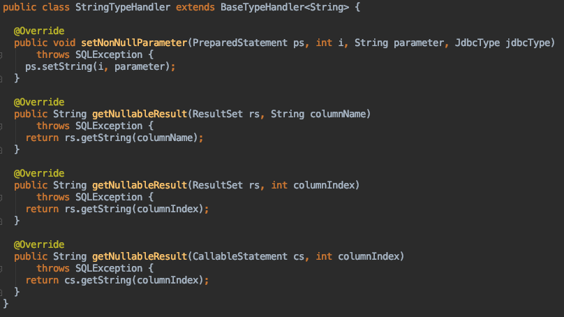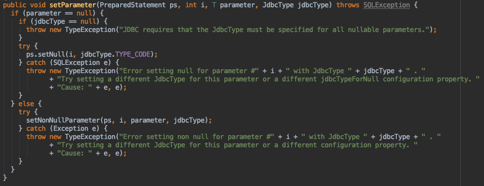 我们常用的TypeHandler基本上都继承了BaseTypeHandler,这里只是对设置的值为null时,做了统一的处理,不为null时则交给具体的TypeHandler来处理