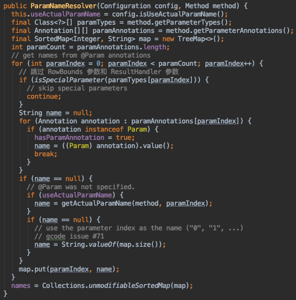 构造函数主要作用就是构造names,保存参数位置和参数名称的映射关系,后续会用。分为两种情况加了@Param注解,和没有加@Param注解