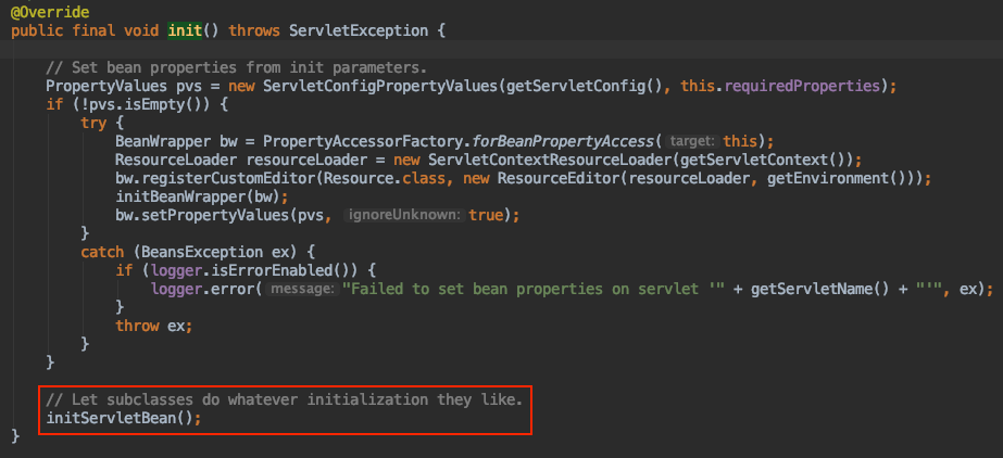 DispatcherServlet中并没有重写init方法,那就实在父类中了,HttpServletBean重写了init方法