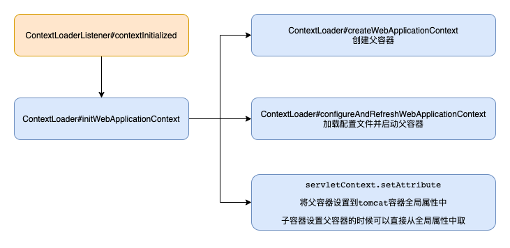 父容器由ContextLoaderListener来初始化,当tomcat启动的时候,发布启动事件,调用ContextLoaderListener#contextInitialized方法,接着调用initWebApplicationContext方法