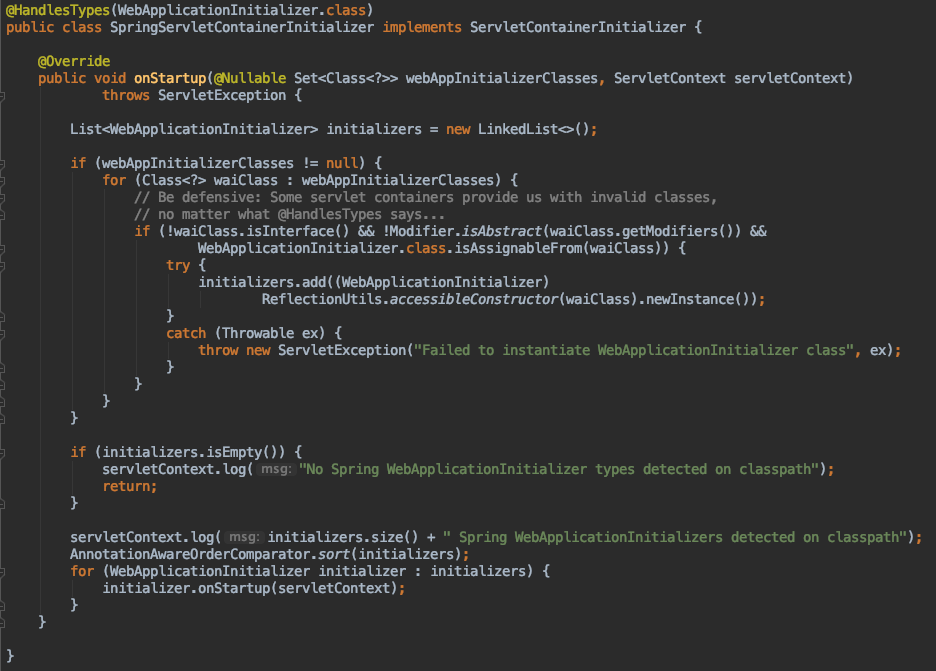 - tomcat启动过程中回调ServletContainerInitializer#onStartup方法,并把@HandlesTypes中的WebApplicationInitializer实现类作为参数传入