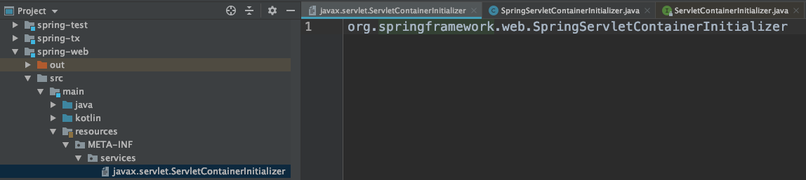 Servlet3.0以后出了新规范,Servlet容器容器在启动的时候需要回调javax.servlet.ServletContainerInitializer接口的onStartup方法,方法的实现类放在META-IN/services/javax.servlet.ServletContainerInitializer文件中,典型的spi代码