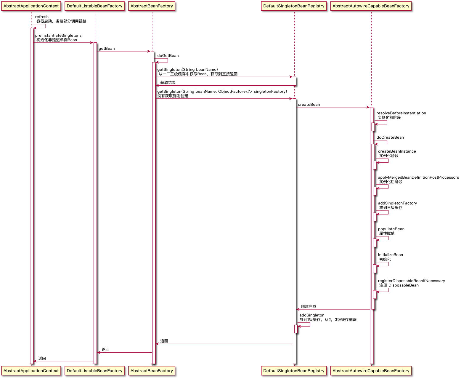 因为初始化非延迟单例Bean的调用链路比较深,我先画一个简图,后续源码解析都围绕这个简图来展开。你可以先看一下这个简图,后续看源码就非常容易理解了!