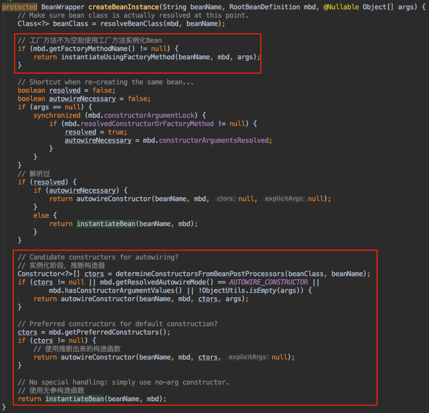 AbstractAutowireCapableBeanFactory#createBeanInstance(省略了部分不常用的逻辑)
