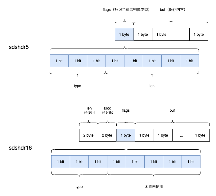 可以看到sdshdr5比较特殊,并没有len和alloc两个字段,那它是如何存已使用和已分配的数量呢?