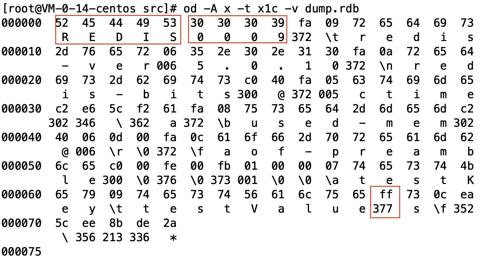 redis为魔数,0009为rdb版本,FF为rdb文件结束符号,FF后面的内容为rdb文件的crc64校验码