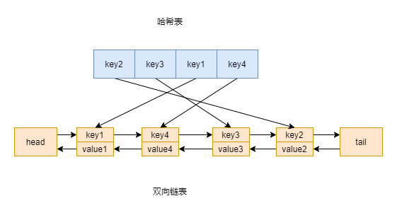 至于为什么是双向链表呢?主要是要删除元素,所以要获取前继节点。数据结构图示如下
