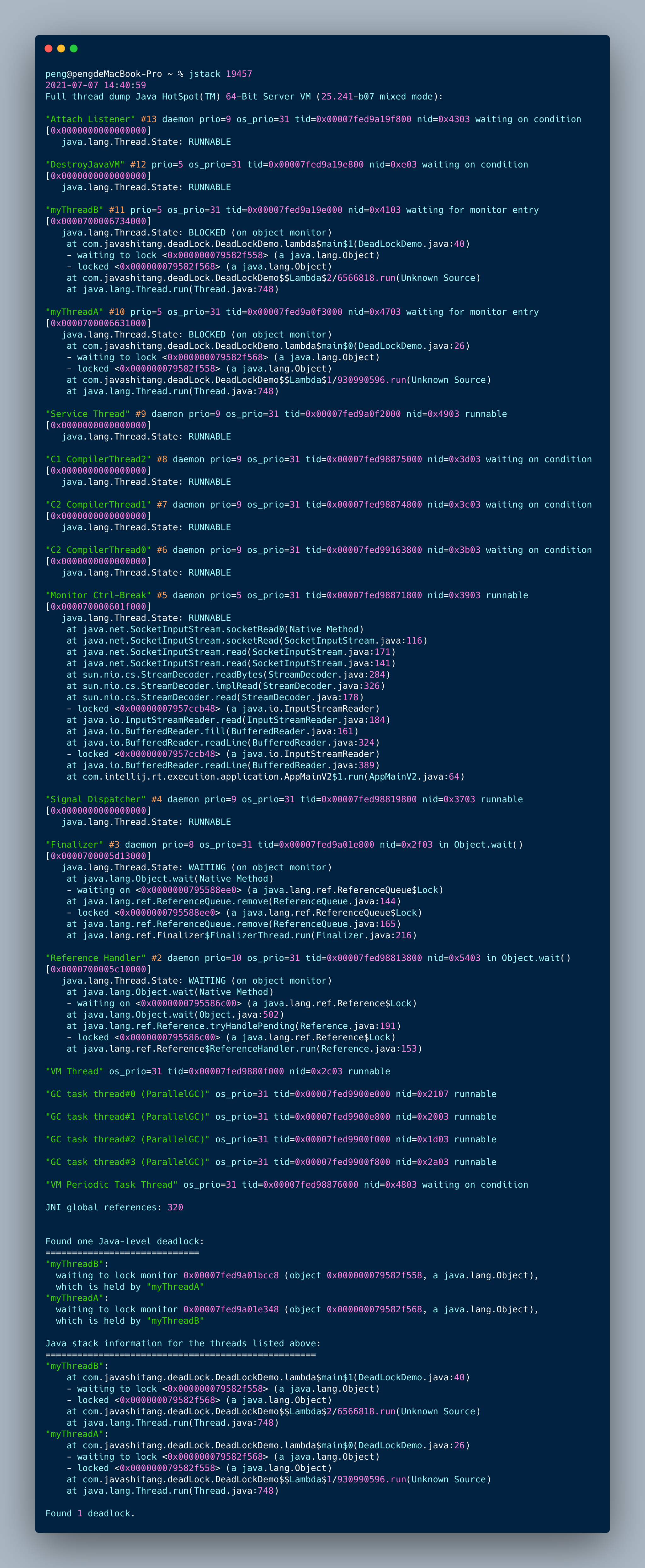 我写了一个死锁的例子,启动后执行jps找到进程id为19457