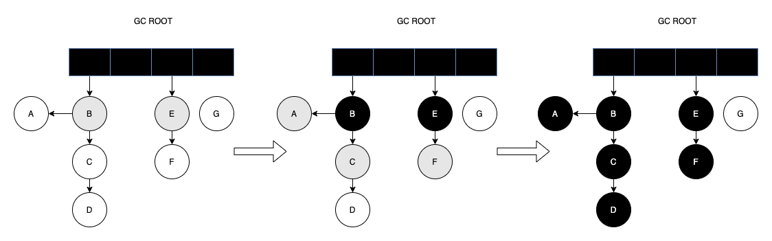 - 先将GC ROOT引用的对象B和E标记为灰色
