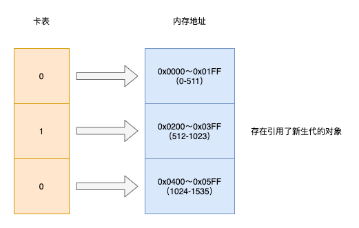 当数组元素值为0时表明对应的内存地址不存在跨代引用对象,否则存在(称为卡表中这个元素变脏)