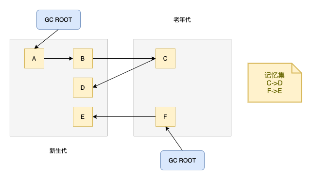 当进行MinorGC的时候,如果我们只遍历新生代,那么可以判定ABCD为存活对象。但是E不会被判断为存活对象,所以就会有问题。