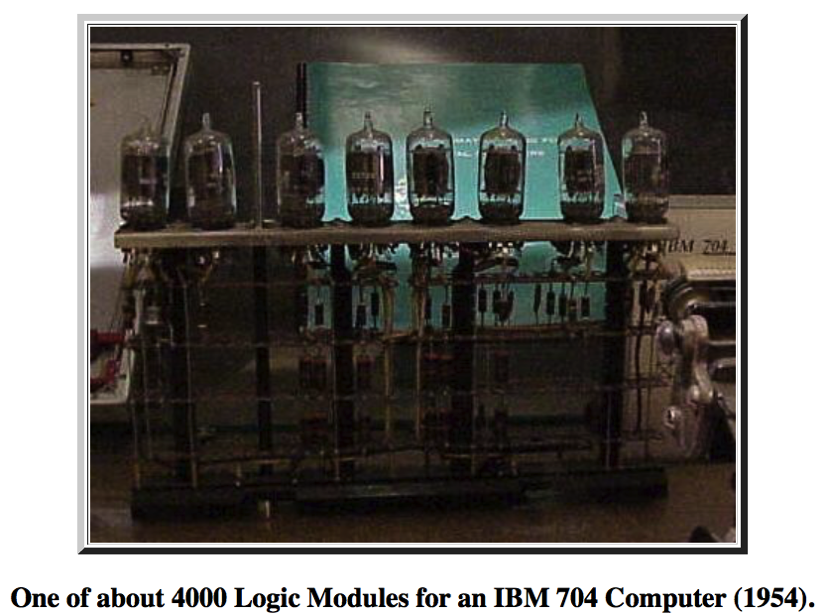 - 对比:含有 50000 真空管的 AN / FSQ-7计算机 占地 0.5 英亩(约 2000 平方米)的楼面面积,重 275 吨,并使用多达 3 兆瓦的电力……http://www.historyofinformation.com/expanded.php?id=964)
