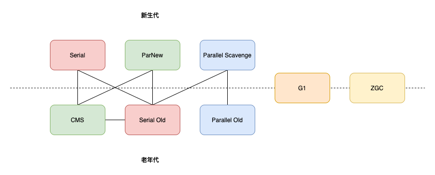 图中展示了七种作用于不同分代的收集器,如果两个收集器之间存在连线,就说明它们可以搭配使用。在JDK8时将Serial+CMS,ParNew+Serial Old这两个组合声明为废弃,并在JDK9中完全取消了这些组合的支持