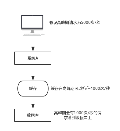 假设有如下一个系统,高峰期请求为5000次/秒,4000次走了缓存,只有1000次落到了数据库上,数据库每秒1000的并发是一个正常的指标,完全可以正常工作,但如果缓存宕机了,每秒5000次的请求会全部落到数据库上,数据库立马就死掉了,因为数据库一秒最多抗2000个请求,如果DBA重启数据库,立马又会被新的请求打死了,这就是缓存雪崩。