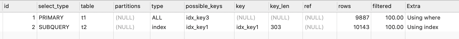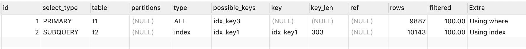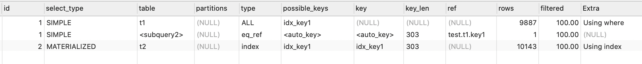 然后看执行计划的前2条记录的id值都为1,说明这2条记录对应的表进行连接查询,需要注意的是第二条记录的table列的值为<subquery2>,说明该表其实就是id为2对应的子查询执行之后产生的物化表,然后将t1与该物化表进行连接查询