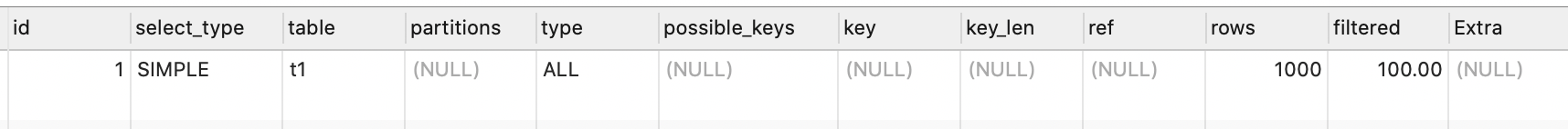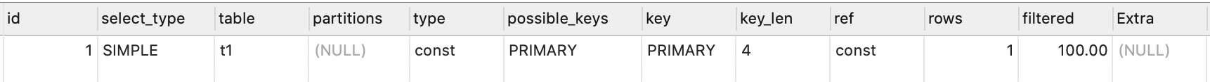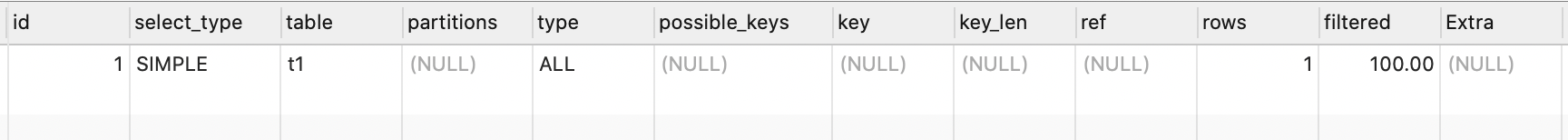无论我们的查询有多复杂,里面包含了多少表,到最后也是对单个表进行访问。explain语句输出中的每一行都对应着某个单表的访问方法,table列为该表的表名