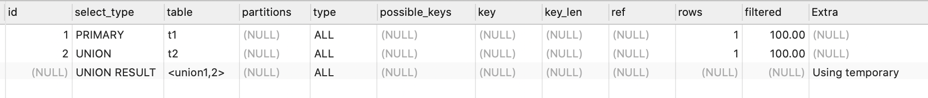 | union result | mysql使用临时表来完成union的去重工作,针对该临时表的查询的select type为union result |
