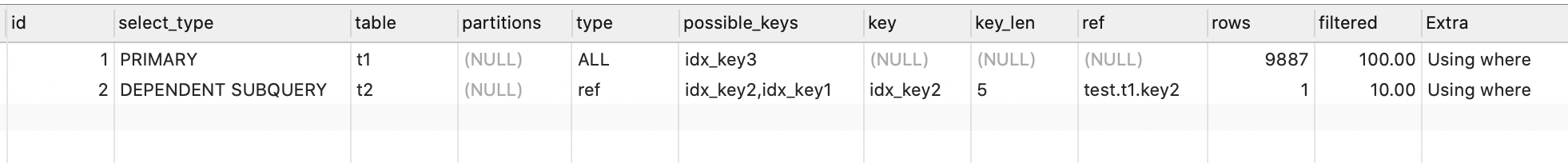 | dependent subquery | 包含子查询的查询语句不能够转为对应的半连接形式,并且该查询是相关子查询,该子查询的第一个select关键字对应的select_type为dependent subquery |