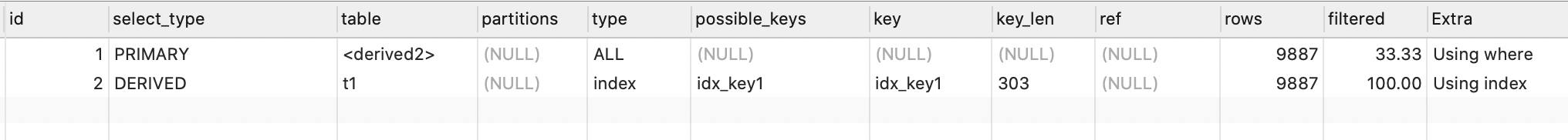 derived_s1为派生表,id为2的记录对应的select_type是DERIVED,说明该子查询是以物化的方式执行的。id为1的记录代表外层查询,它的table列显示的是<derived2>,说明该查询是针对将派生表物化之后的表进行查询的
