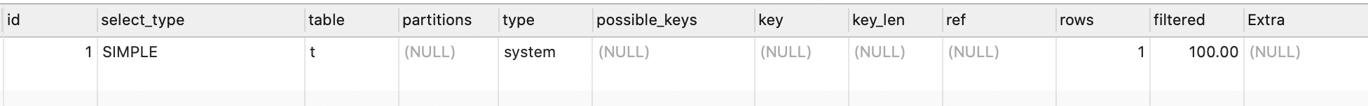 | system | 表中只有一条记录并且该表使用的存储引擎的统计数据是精确的,派生表为只有一条数据的子查询 |