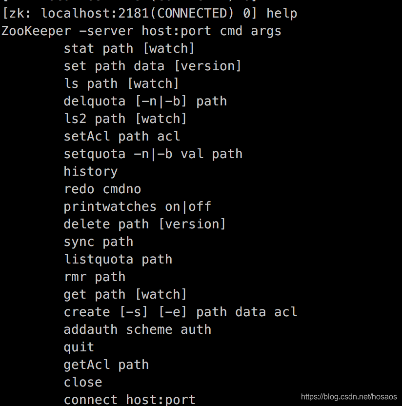 在该命令行界面可以输入 help 来查询zk相关命令