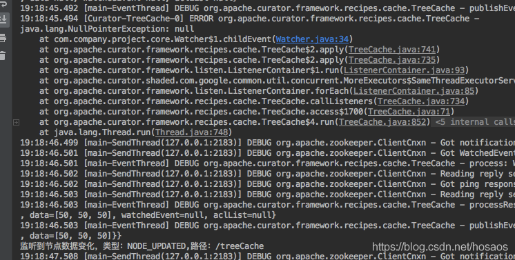 图一里可以看到 监听到了父节点的数据变化,但是有个空指针异常,这是因为TreeNode不像NodeCache和PathChidrenCache在start()时能传入参数来决定是否初始化本地缓存中的节点数据,TreeNode在start()后没有初始化好本地节点缓存,这个时候在监听器内调用event.getData()方法时实际取的是本地缓存中的节点数据,所以会报错。所以正确的写法应该在监听器的处理方法中根据event事件类型来做不同处理,不能无脑调用getData()方法。