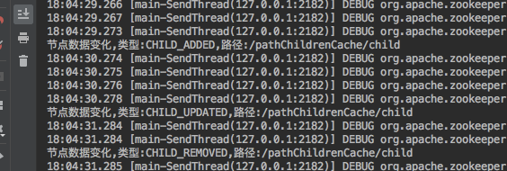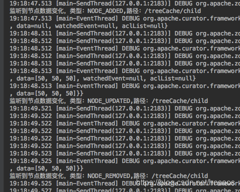输出如下,可以看到监听到了子节点的增(CHILD_ADD)、删(CHILD_REMOVED)、改(CHILD_UPDATED)事件