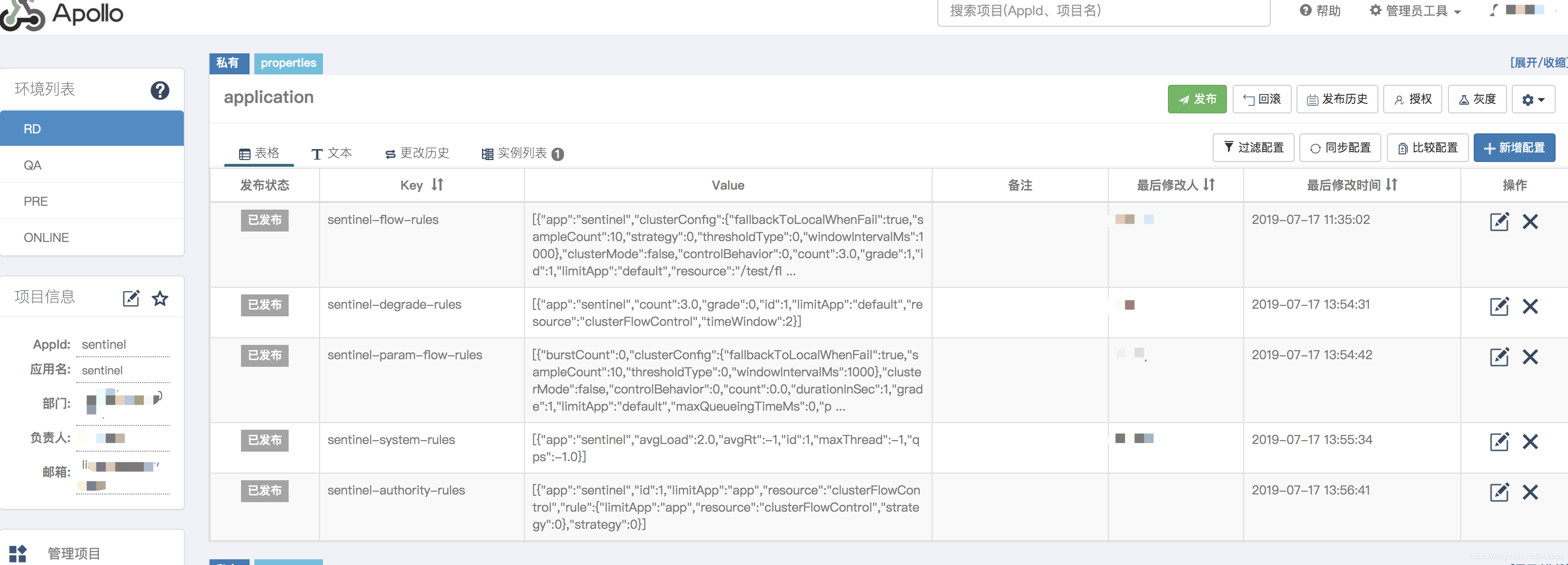 配置中默认namespace为application,即每个应用只在application中管理自己的限流规则,先看个Apollo中规则存储的效果图,我新建了一个Sentinel的应用,其在application默认namespace中管理自己的限流规则