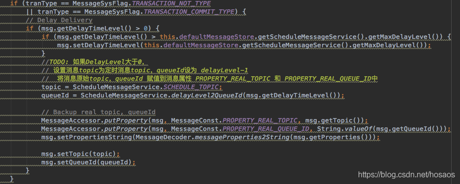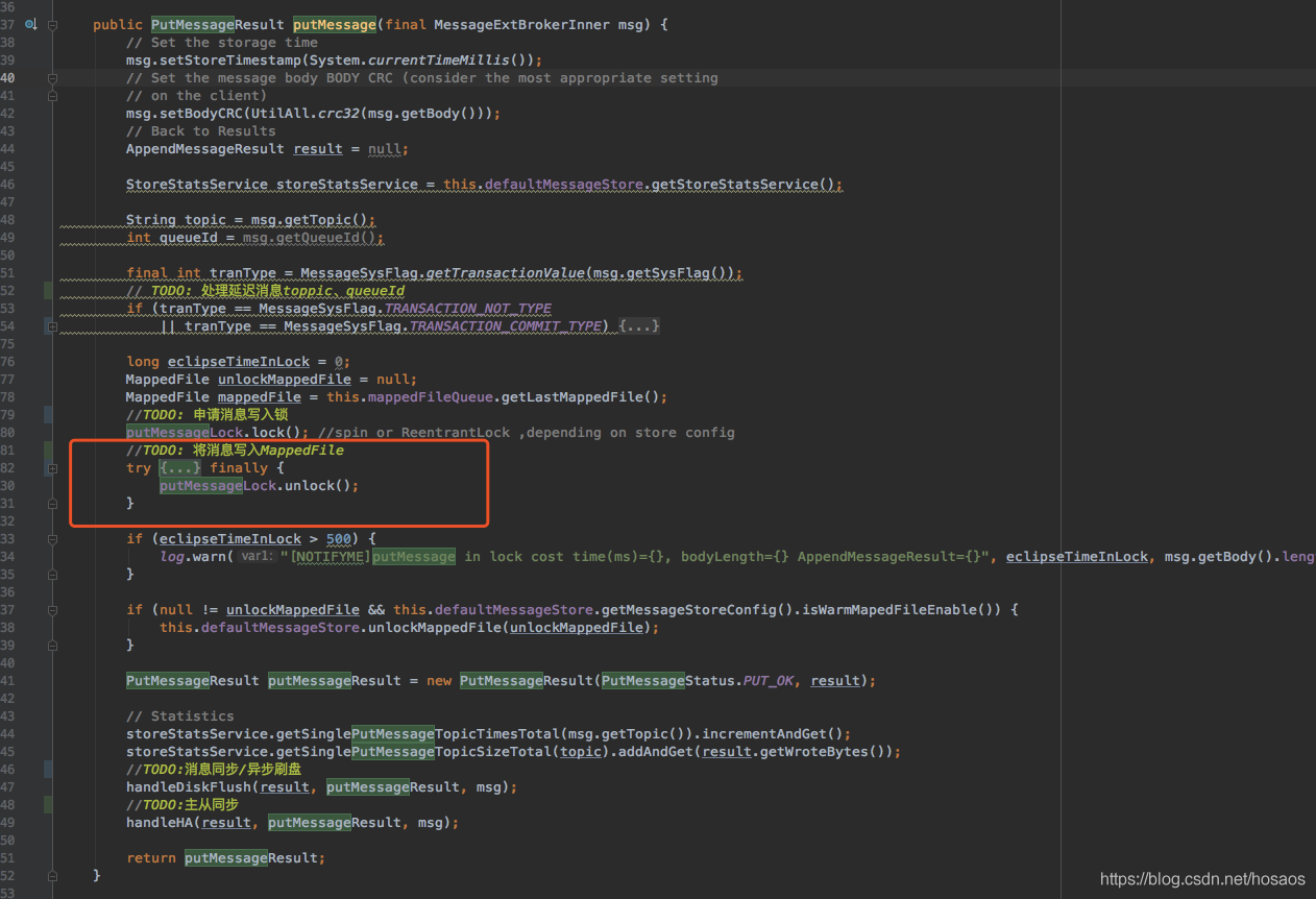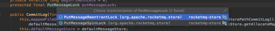 延迟消息之所以不会被立马消费,就是因为消息存储时其原有topic,queueId被存储起来,同时修改其topic为”SCHEDULE_TOPIC_XXXX“。 - putMessageLock申请消息写入锁
