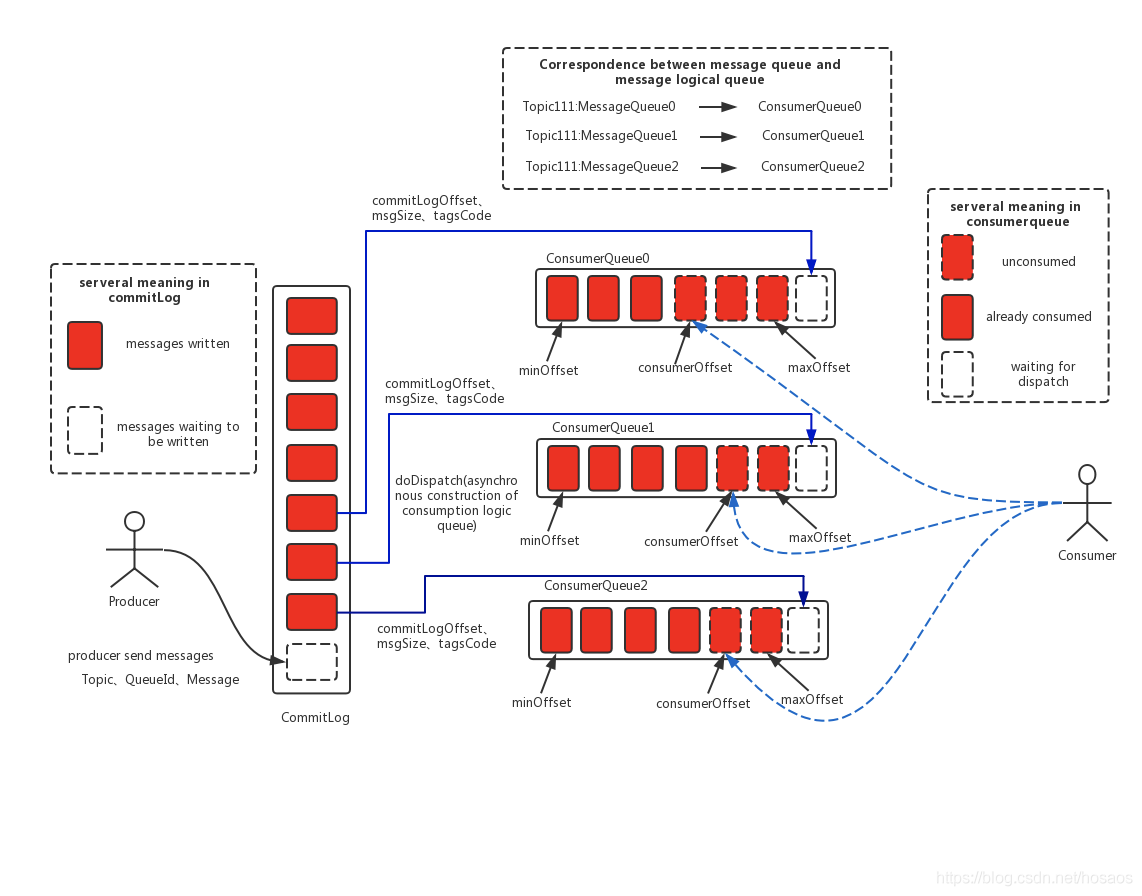 - 通过CommitLogDispatcher.dispatch方法异步分发请求并构建出ComsumerQueue文件和IndexFile文件