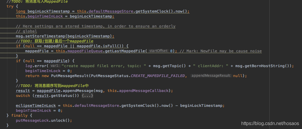 回到文中代码,看下try方法中的写入MappedFile的实现