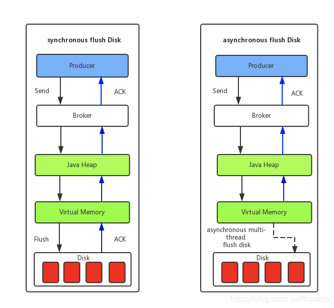 (1) 同步刷盘:如上图所示,只有在消息真正持久化至磁盘后RocketMQ的Broker端才会真正返回给Producer端一个成功的ACK响应。同步刷盘对MQ消息可靠性来说是一种不错的保障,但是性能上会有较大影响,一般适用于金融业务应用该模式较多。