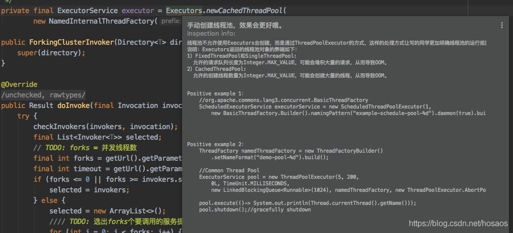 大家使用过IDEA的阿里巴巴代码规约插件的,肯定也看到过如下提示,其不推荐使用Executors来创建线程池,现在明白原因了吧?