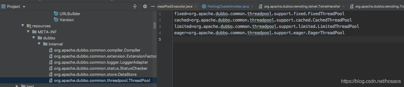 可以看到Dubbo里有4种线程池实现,分别是FixedThreadPool,CachedThreadPool,LimitedThreadPool,EagerThreadPool