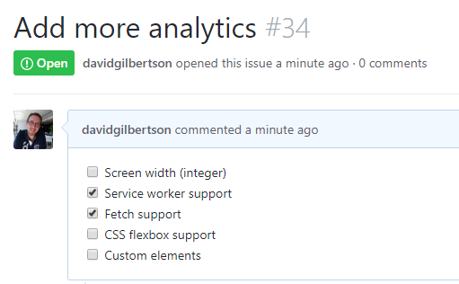 - [] 屏幕宽度(整数) - [ x ]服务人员支持 - [ x ]提取支持 - [] CSS flexbox支持 - []自定义元素