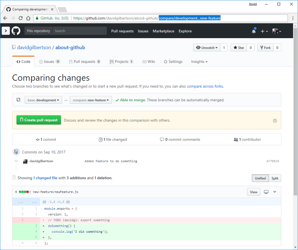 使用 UI 浏览 GitHub 是很好的。 但是有时候,最快的方法就是在 URL 中输入。 例如,如果我想跳转到我正在处理的分支,并且查看它去主分支的区别,我可以在我的 repo名称之后键入/compare/分支名称。
