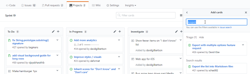 你可以点击右上角的 Add Cards,找到要添加的内容。 此时特殊搜索语法就派上用场了,例如,输入 is:pr is :open 便可以将任何公开的pull 请求拖动到项目板上,或者输入 label:bug 即可粉碎一些 bug。