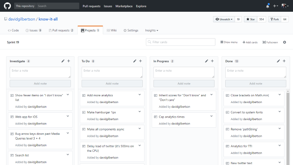 我在过去三周里我不再使用 Jira,而是一直在 GitHub 上做所有的任务,这是一个我很喜欢的有点看板风格的小项目。