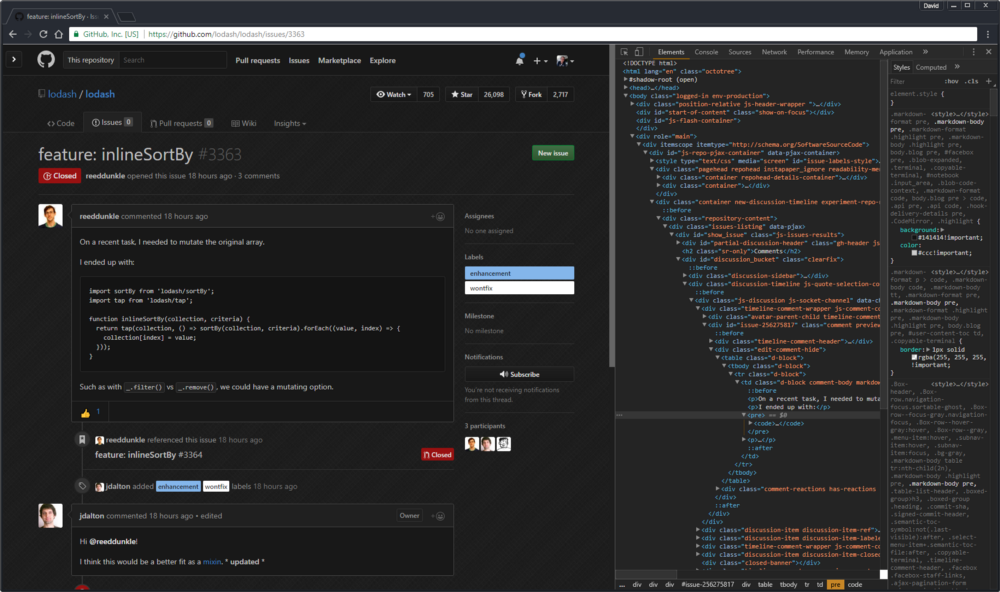 这是 Stylish Chrome扩展程序(可以将主题应用到任何网站)和 GitHub Dark 风格的组合。为了完成外观,可以使用 Chrome DevTools 的黑色主题(内置的,在设置中打开)和 Chrome 的 Atom One Dark 主题。