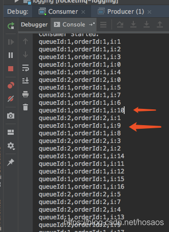 看下结果输出,如图,同一个orderId下,编号为10的消息先于编号为9的消息被消费,不是正确的顺序消费,即普通的并行消息消费,无法保证消息消费的顺序性