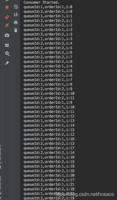理想情况下消息顺序消费的结果应该是,同一个orderId下的消息的编号i值应该顺序递增,但是不同orderId之间的消费可以并行,即局部有序即可