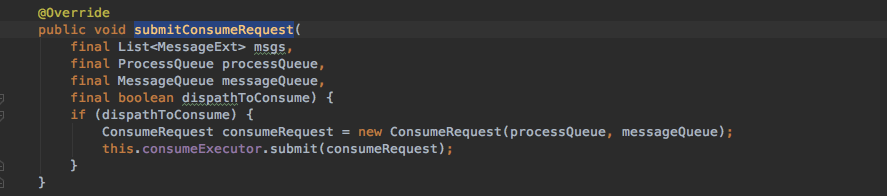 假设消费者对messageQueue的加锁已经成功,那么就进入到了第二个步骤,创建pullRequest进行消息拉取,消息拉取部分的代码实现在PullMessageService中,消息拉取完后,需要提交到ConsumeMessageService中进行消费,顺序消费的实现为ConsumeMessageOrderlyService,提交消息进行消费的方法为ConsumeMessageOrderlyService#submitConsumeRequest,具体实现如下